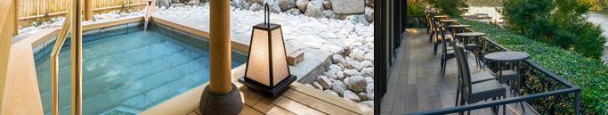 Among our 39 modern guest rooms designed with traditional Japanese aesthetics, 17 of them feature an open-air bath where guests can enjoy natural spring water. We also offer two private open-air baths where guests can experience Kyoto's tranquil atmosphere while gazing out onto our Takeoto no Niwa Japanese gardens and soaking in the natural Arashiyama hot spring.