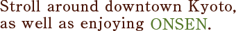 Natural ONSEN near such tourist destinations are among the best places to heal yourself while enjoying the essence of travel. There, charming facilities offer warm treatment to tourists, and are cherished by many people, including Kyoto connoisseurs, as ideal places to take a rest, purifying themselves before visiting shrines and temples or simply healing their tiredness.